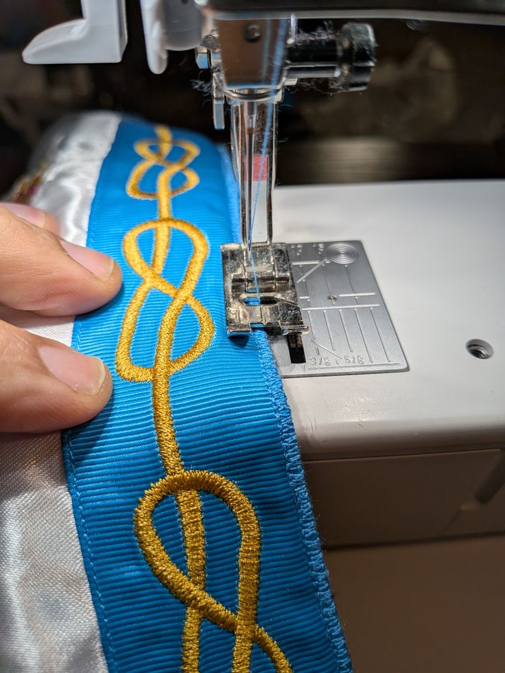 Broderie des motifs, découpe du tissu recto/verso de la bavette, couture des rubans gros grain selon la même méthode que le corps du tablier maçonnique.