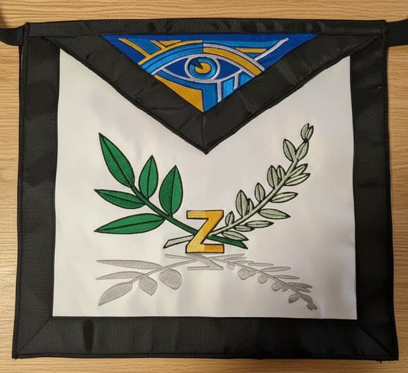 Des rosettes complètent souvent l’ensemble : trois au total dans de nombreuses traditions, symbole de la trinité maçonnique Sagesse-Force-Beauté. La bavette, définitivement rabattue, reçoit généralement l’étoile flamboyante ou le delta rayonnant — signatures visuelles immédiates du grade de Maître, reconnaissables même de loin.