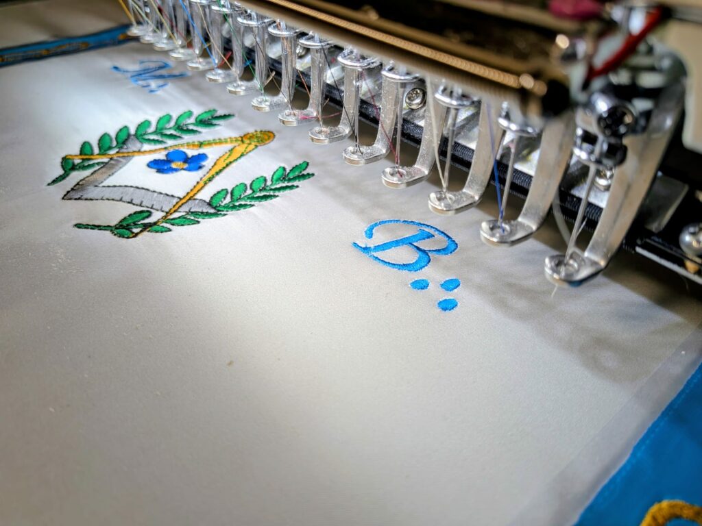 Au Rite Émulation par exemple, le Compagnon porte deux rosettes bleues en bas du tablier, tandis que le Maître en ajoute une troisième sur la bavette, accompagnée de glands d’argent. Ces ajouts successifs marquent la progression, chaque rosette supplémentaire signalant une étape franchie.